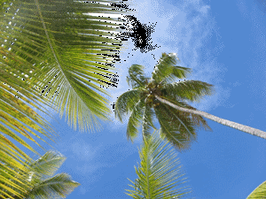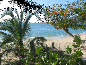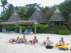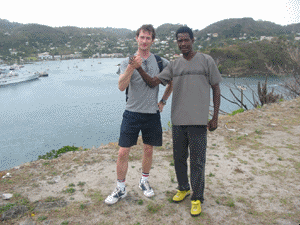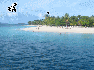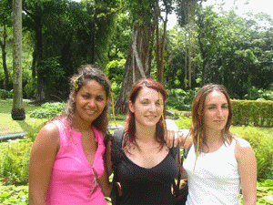 Temps gris surtout le matin. Location d'un taxi avec Stef, marie, Julie, Hanissa, Cécilia et Hervé : visite du fort surplombant la ville, puis un jardin botanique (visite guidée). Au retour, le chauffeur ne voulait pas nous emmener jusqu'au Vermont : on s'est effrité avec lui. Finalement, on est rentré à pied (25 mn) jusqu'au bateau en lui payant que la moitié que de ce qui était convenu. 13h15 : départ en taxi (un autre) tous les 7 pour la plage. On a pris ensuite un petit bateau pour aller sur la plage privée de Young Island (îlot où il y a un cottage, hamacs, bar à rhum dans l'eau. |