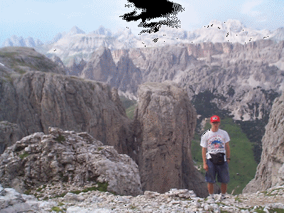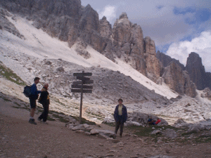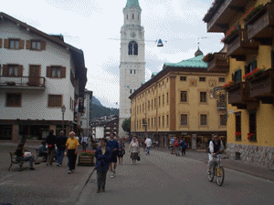 Par un temps nuageux, nous sommes allés en voiture jusqu'à Passo di Falrego (2105m). Nous sommes montés à pied vers le sommet d'un téléphérique: Lazazoui (2752m), mais à une bifurcation (Forcla Travenanzes(2507m-photo à gauche), nous avons préféré prendre un sentier entre les dolomites jusqu'à la pointe Mezzo (2584m) : sentier magnifique. De retour en bas vers 15h30, nous sommes allés ensuite à Cortina d'Ampezzo (photo au milieu : visite du village et de cette grande station de sport d'hiver. Puis, nous sommes allés en voiture jusqu'à Sexten où nous avons logé. |