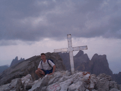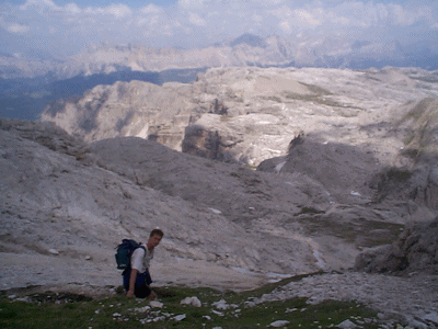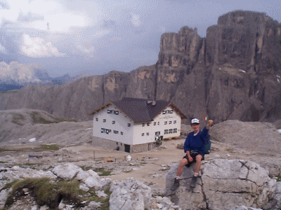 En allant vers le Grodner Joch situé à 2100 mètres, on s'est retrouvé bloqué dans la monté car il y avait une course cycliste : le marathon des cyclistes dans les dolomites : plus de 6000 coureurs. Le beau temps du matin s'est transformé en un temps pluvieux en début d'après-midi. On a renonce à continuer une route qui allait en direction de la Puez hütte. Vers 15h30, mon frère et moi sommes montés à la Piscadiu hütte (500 mètres de dénivéllation) : chemin assez technique entre les rochers, sur les pierres, puis avec des cordes et des anneaux : impressionnant, mais quelle vue d'en haut. La durée était d'1h30 pour la montée. |