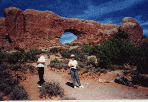 Départ de la plus sympathique des villes de l'ouest pour moi tant par l'environnement (montagnes et lac) que par le coût de la vie, pour aller vers le parc national ARCHES. Ce parc est constitué des dunes pétrifiées, hérissées de doigts, de tours, de pitons et de rochers suspendus. La chaleur était suffocante : 40° à l'ombre. |