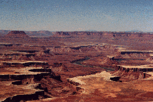 Le temps est toujours très chaud 106 faraheit soit ~ 40°. On fait un détour pour aller visiter CANYONLAND *** : au bout de la route le point de vue est spectaculaire : vue sur le Colorado encerclé par ses canyons rouges... |