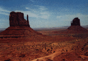 Arrivée aujourd'hui dans un nouvel état : l'ARIZONA. La route 163 est magnifique avec une diversité impressionnante des paysages. Arrêt à Monument Valley (ci-dessous) : on se croirait dans un film western d'autant que l'endroit est gardé par des indiens. Nous sommes allés à l'intérieur du parc en voiture (qui a commencé à chauffer d'ailleurs). Il vaut mieux prendre un 4*4 pour touristes. |