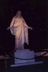 Temps toujours très ensolleillé. Arrêt à la ville de Jackson Hole situé à 10 km de Téton village : ville très originale où la plupart des pays sont comme au Far West. Longue route ensuite jusqu'au fameux lac salé de Salt Lake city. Pour s'approcher du lac, il fallait de nouveau pays (6$). Sans plan dans une ville de 160000 habitants, nous avons galéré pendant 1h30 à la recherche de notre hôtel. Visite du temple Mormon (avec la fameuse statue ci-contre). A noter que les prix ne sont pas du tout chers en Utah : un repas (steak, frites, salade) à 6$ soit 30F à l'époque alors que dans les autres régions cela coûte 2 fois plus chère. |