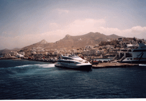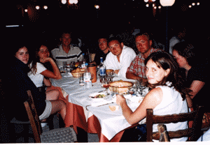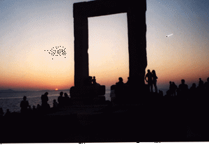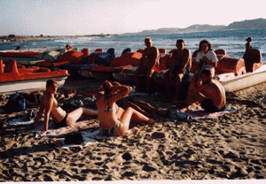 12h: arrivé à Naxos : les responsables des différents campings sont venus auprès de nous pour nous inciter à aller dans le leur. Après une longue discussion, nous avons préfére le camping avec la piscine. Nous avons ensuite fait une ballade le long de la superbe plage de sable blanc et fin vers un restaurant exotique comme aux antilles. Après un tour en ville pour louer une voiture et répérer les horaires des bateaux, nous avons passé la fin de l'après-midi à la plage. En soirée, Arnaud, Eric et moi sommes allés chercher les voitures de location : 2 suzuki pas très entretenus....Après un petit détour pour retrouver le camping et chercher le reste du groupe, nous sommes allés manger au port. On a pris les chips que Luc avait commandé pour un apéritif que nous offrait le restaurant. En fait, il s'agissait de son repas : le serveur s'était trompé dans sa commande. Histoire de faire que des gaffes, ils nous ont encore compté une pizza en trop alors qu'on n'en avait pas commandé. Nous avons fait venir le patron pour régler ces problèmes. Il était bien content quand nous sommes partis. Puis, nous sommes allés prendre une glace ou une gauffre jusqu'à 1h30. |
