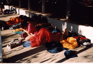 En soirée, Arnaud, Eric et moi sommes allés chercher les voitures de location : 2 suzuki pas très entretenus....Après un petit détour pour retrouver le camping et chercher le reste du groupe, nous sommes allés manger au port. On a pris les chips que Luc avait commandé pour un apéritif que nous offrait le restaurant. En fait, il s'agissait de son repas : le serveur s'était trompé dans sa commande. Histoire de faire que des gaffes, ils nous ont encore compté une pizza en trop alors qu'on n'en avait pas commandé. Nous avons fait venir le patron pour régler ces problèmes. Il était bien content quand nous sommes partis. Puis, nous sommes allés prendre une glace ou une gauffre jusqu'à 1h30. Nuit à la belle étoile au camping sauf pour Audrey et Sébastien. |