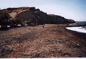 L'après-midi, nous sommes allés nous balader jusqu'à une plage de sable fin noir ce qui en fait la spécificité de cette île. Cela est du au fait que l'île était auparavant un volcan. Le soir, nous sommes allés dans les rues animées de Fira où nous avons trouvé pour une fois un restaurant chic où les serveurs parlaient en français. De retour au camping, nous sommes allés boir un verre auprès de la piscine avec les bons qu'on nous avait remis dans le bus. En fait, ils permettaient d'avoir un minuscule kamikaze gratuit contre une boisson achetée. |
