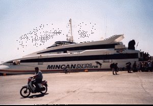 Matinée repos au camping. Vers 12 heures, nous avons repris nos sacs à dos pour aller au restaurant exotique de la veille : musique reggae avec palmiers et la plage en arrière plan. Sebastien ne se sépare plus de son cure-dents. A 14h30, nous avions prévu de prendre la bateau (un hydroglisseur) en direction de MYCONOS. Malheureusement, il n'y avait plus de billets. Comme c'était le seul de la journée avec notre compagnie, nous étions condamnés à rester sur cette île. On a essayé de négocier sur le port pour aller au moins jusqu'à Paros en vain. |