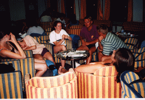 Nous avons alors décidé de réserver le bateau qui partait à Paros pour 23 heures. En attendant, nous avons squatté une terrasse de 16h à 22h30 : discussions et 4 heures de tarot sous le soleil entre Babette, Arnaud, Eric, Luc et moi. 23h15 : départ du bateau pour Paros : 1 heure de traversée. Frédérique a hésité à prendre un exta pour tenir le coup. 0h15 : arrivée à Paros : nous avons longé la mer pour rechercher un endroit où dormir. Au bout de 20 mn, nous nous sommes arrêtés près d'une maison en construction à côté de la plage. Nous nous sommes réfugiés là-dedans au premier étage. Le temps de s'installer en silence, il était déjà 1h30 quand nous étions couchés. |