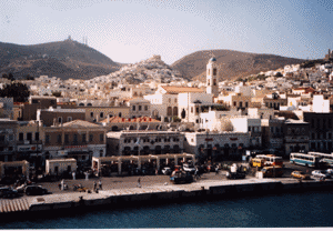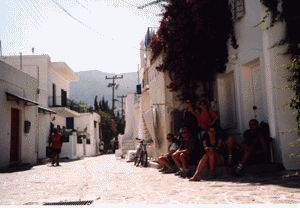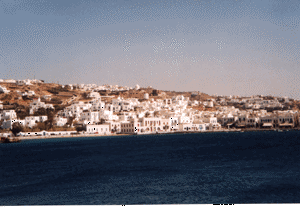 15h15 : départ du bateau : 1h de traversée à bord d'un hydroglisseur. Ensuite, Frédérique, Eric et moi avons galéré pour chercher des billets de bateau pour revenir à Athènes. Au bout d'une heure, on a finalement eu des billets pour le lendemain à 15h sur un bateau lent. Nous n'avions plus le droit de revenir en hydroglisseur dans la capitale grecque alors qu'il nous restait encore des billets avec notre Pass : très bizarre. 18h30 : arrivé au camping "Paradise" : où l'ambiance était assez mouvementé : c'était déjà la fête avec une boîte à côté de la plage. A noter qu'on a du attacher les tentes avec des pierres tellement le vent était fort. Vers 21h, nous avons pris la navette pour aller au centre de Mykonos : très jolies maisons blanches aux portes et toits bleus. Les prix dans cette ville, très réputée pour la fête et les homosexuelles, sont beaucoup plus élevés. Après un bon restaurant et une visite dans les ruelles, nous sommes allés dans un bar/boîte situé à côté de la mer. Cécile, Audrey et Eric étaient les premiers dans la bôîte pendant que Fred, Babette, Arnaud, Sébastien, Luc et moi discution dehors. Parfois, l'écume des vagues venaient s'échouer sur la terrasse. A la fin de la soirée, après une visite de Mykonos la nuit, Audrey, Cécile, Eric, Arnaud , Sébastien et moi nous nous sommes un peu perdus dans les rues. A 5h passé, nous étions de retour au camping. Fred, Babette et Luc dormaient déjà. |