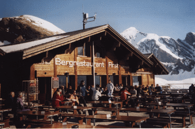 Levé de très bonne heure après une nuit bien difficile (froid pour certains et surtout manque de place pour les jambes). A 6h du matin, nous avons donc pu voir le lever du soleil. Chants pendant une heure pour se réchauffer (tout le répertoire des années 80 et 90). Nous sommes montés au FIRST en fin de matinée (3h au lieu des 1h30 de prévu en été, mais avec les détours et toute la neige, le temps est doublé). Là bas, nous avons posé les lourds sacs à dos. Après une petite sieste bien méritée vu le peu d'heures de sommeil les deux derniers jours, nous avons fait une petite ballade pendant 2h. Le soir, retrouvailles avec les douches et un bon petit repas au bergrestaurant du First (soupe, salade mêlée, cordon bleu/frites, mousse moka). Décalage horaire en plus cette nuit : on avance une heure. |
