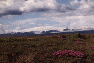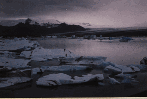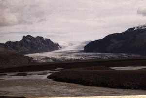 Au détour de notre route aujourd'hui apparaît brusquement un spectacle extraordinaire : un immense glacier, le Vatnajökull s'achève en iceberg dans la mer. Le glacier couvre près de 9000 km2 : il atteint son point culminant au Hvannadalhnukur (2119m) qui est un volcan sous-glace dont les éruptions en 1362 et 1727 ont dévasté toute la région. |