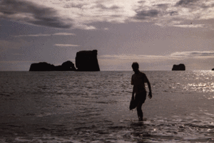 Durant l'après-midi, nous nous sommes arrêtés sur une des rares plages d'Islande que nous ayons vu. Nous avons marché sur le doux sable noir, et j'en ai profité pour mettre les pieds dans l'eau froide de la mer. Après Stafafell, on a franchit une rivière glaciaire, ouis on est redescendu vers le Papafjordur dans un vaste et austère paysage marin. 19h : arrivé à Höfn : nous avons logé dans un hôtel qui sert d'école le reste de l'année. |