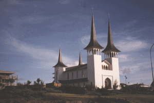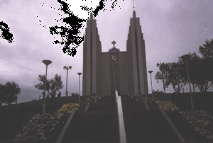 Après voir longé une dernière fois la plage, nous sommes arrivés en début d'après-midi dans la troisième plus grande ville d'Islande : Akureiry (13594 habitants). Nous avons visité l'originale église (ci-contre), et nous avons fait du shopping. Au restaurant, le soir, il y avait pour la première fois une serbeuse qui comprenait un peu le français. |