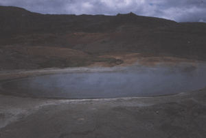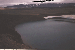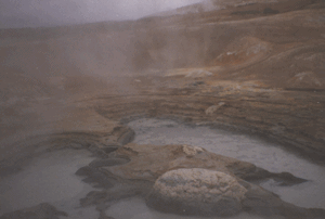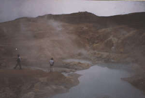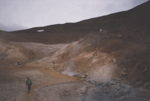 A une heure en voiture d'Akureiry se trouve la spendide chute d'eau de Godafoss : c'est une impressionnante chute formée les eaux tumultueuses d'une rivière qui se précipite dans un goulet bordé de parois basaltiques. Après Myvatn, nous avons continué la route vers le volcan de Krafla (818m). La dernière éruption date de 1991. Arrêtés à un parking, nous avons une petite ballade vers le cratère de Vik (en haut à droite) ainsi qu'à travers les fumerolles de souffre et les marmittes d'eaux bouillonnantes (voir photos ci dessous). En fin d'après-midi, nous sommes repartis sur le site de Myvatn. |
