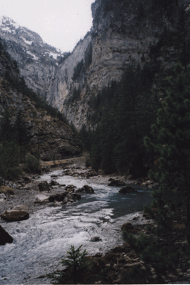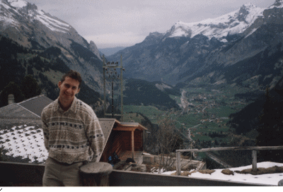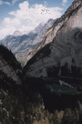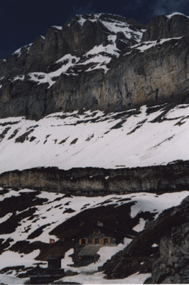Magnifique temps : petit déjeuner avec vue sur les Alpes valaisannes. Nous avons repris le chemin dans le sens inverse vers Kandersteg avec une variante avant Stock. Descente le long du télésiège dans la neige, puis c'était reparti pour la traversée du désert blanc (le Daubensee)(ci-contre). Chocolat chaud ou thé à la Schwarenbach hütte (à gauche en bas). La descente finale vers le village s'est effectuée le long d'une paroi rocheuse avec vue plongeante sur la vallée (ci-dessous). Nous avons pu voir des troupeaux de chamoix. 16h : arrivée à Kandersteg où nous avons trouvé un hôtel : quel plaisir de prendre une douche, un repas copieux (autre que saucisses) et surtout de dormir sur un lit bien douillet au chaud. |