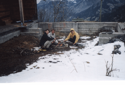 Là haut, déception : téléphérique fermée (ouvert sur mon prospectus), et impossible de trouver le chemin pour descendre à Leukerbad (impraticable). Nous avons trouvé un poste de secours qui ne marchait pas : décidément la guigne nous poursuivait. Nous avons appelé les secours avec le téléphone portable (30 mn à expliquer la situation pour finalement ne pas avoir de réponse). Dans notre malchance, nous avons trouvé un WINTERLAGE (abri sous un refuge en été) avec un poêle à bois, 4 lits avec couvertures, 4 chaises et du bois.... incroyable : on se serait cru dans "les bronzés font du ski". C'était donc reparti pour une 2ème soirée saucisses/merguez auprès du feu. |