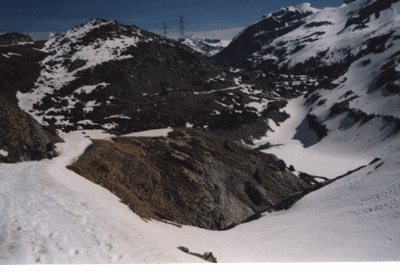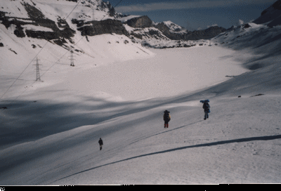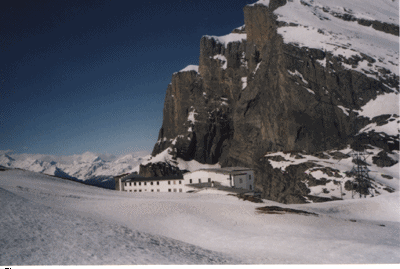 Par un temps nuageux et un levé matinal (7h30), nous sommes partis vers la Lammeren hütte (2589m) où nous avions réservé un refuge afin de bien manger et dormir sur de bons draps dans une chambre chauffée. Optimiste, car nous n'avons jamais réussi à atteindre ce refuge : trop de neige : on enfonçait jusqu'à la taille parfois et régulièrement jusqu'aux genoux notamment sur le Daubensee après avoir pris un chocolat chaud vers 10h au refuge Schwarenbach (2040m) (ci-dessous). Avec un sac de 12 kg sur le dos, c'était très physique. Nous avons finalement décidé d'atteindre le Gemmi Pass (1h pour faire 500m tellement il y avait de neige : ci-contre). |