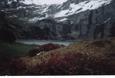 Départ à 3h49 du matin de la gare de Strasbourg en direction de Kandersteg. Arrivée à 8h30 après un changement de train à Bâle. Notre but dans notre rando itinérante était d'atteindre la canton du Valais en passant par le Gemmi Pass pour atteindre Leukerbad derrière, puis Crans Montana avec pour objectif de redescendre à Sierre. Quel ambition !!! Détour pour monter au somptueux lac de l'Oschinensee (ci-contre) avant de redescendre à Kandersteg pour remonter ensuite à Sünnbuhl (1930m), mais la neige et la fatigue nous ont contraint à nous arrêter à Stock. Cela tombait bien, il y avait 2 maisons, mais fermées malheureusement. Nous devions nous résoudre à dormir à la belle étoile (abri ci-dessous). Nous étions armés cependant avec nos sacs de couchage et nos bonnets. Feu de bois avant une nuit fraiche en montagne. |