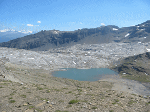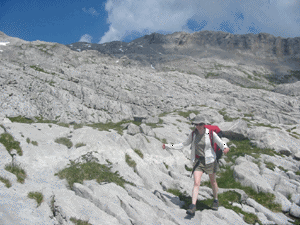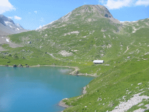 Petit déjeuner à 7h30 (les derniers) pour un départ à 8h15 encore sous un ciel radieux, direction le col du Rawil (2420m), le plan des roses avec son mignon petit lac, le lac de Ténéhet blottie au creux des montagnes rocheuses (2367m), le passage par les lapias (formation étrange de la roche suite à l'érosion), le col des eaux froides (2680m) avant de redescendre sur le lac et la cabane des audannes. Soupe aux légumes, spaghettis bolognaises, salade de fruits pour le souper, mais tjs pas de douche et des WC à l'extérieur du refuge cette fois. |