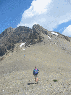 Journée la plus dure et la plus longue du parcours. Départ à 8h15 pour monter col de la Selle, puis le col des Audannes (2850m) : descente technique avec 5 échelles et des barres pour la suite de la descente sur quelques mètres. La descente se poursuit sur des cailloux jusqu'aux Gouilles. Paysages très désert, mais impressionnant jusqu'à la crête de l'arpille (2600m). De là bas, nous prenons un chemin à gauche non balisé en direction du sommet de l'Arpelistock (3030m). Le ciel bleu se partage avec les nuages aujourd'hui. La montée est raide et on sent les mollets. Quel soulagement d'arriver au sommet avec une vue imprenable sur les alpes valaisannes. La descente se fait sur les névés et sur les fesses (luge improvisée). Le sentier se poursuit sur des cailloux le long de nombreuses cascades avant d'atteindre le refuge de la Gentenhütte. Stéphane en venant nous rechercher se fait une entorse à la cheville. |