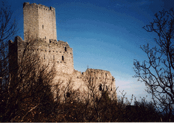 Samedi, 31 mars 2001 : Montée en haut de la montagne en forme de pyramide à savoir l'Ungersberg située à 901m. Puis, nous sommes allés visités les châteaux du Bernstein, de l'Ortenbourg (ci-contre), du Ramstein avant de redescendre dans la vallée. |
